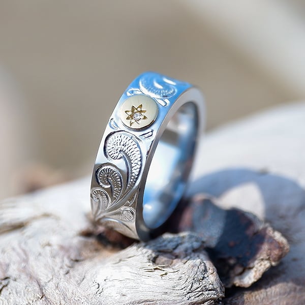 プカナ・ラー(pukana la)はハワイ語で「日の出」を意味し、太陽、月、星が共存する瞬間を表現する言葉です。 燦燦と輝くゴールド太陽!その周りをぐるりと波柄をいれた、 幻想的な世界観を落とし込みました。 《ラー=太陽》 月と星の夜空から、徐々に明るさが増し、太陽が不意に昇り始めた喜びー 太陽の光の持つ、力強さや高揚感はたとえようもありません。 男性にも女性にも、ジェンダーレスにお使いいただけるモチーフです。刻印可能です!ペアリングとしてお楽しみください!!