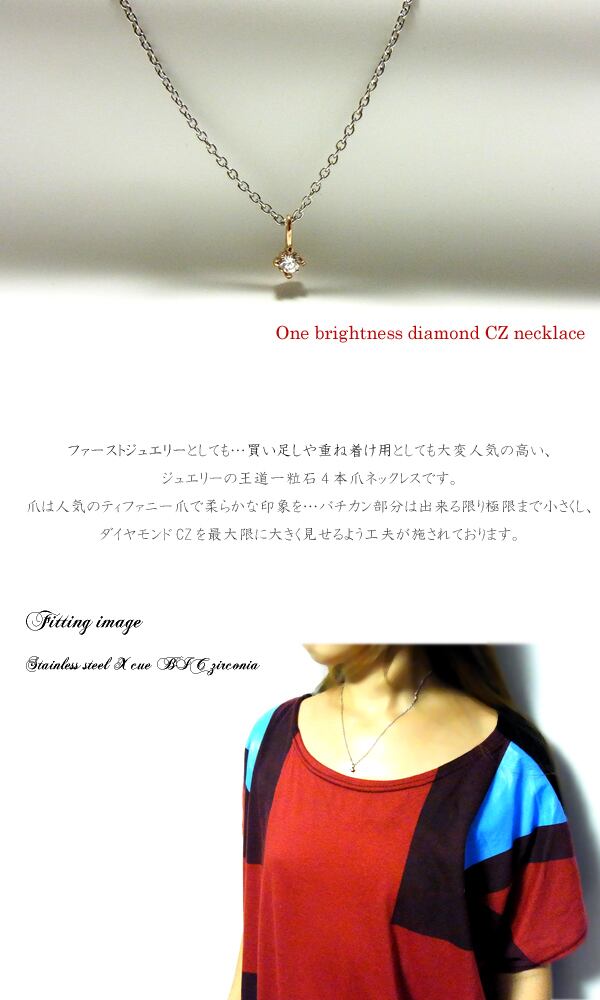 ジュエリーの王道4爪ネックレスです。爪は人気のティファニー爪でやわらかな印象を。ダイヤモンドCZを最大限に大きく見えるよう工夫されています。