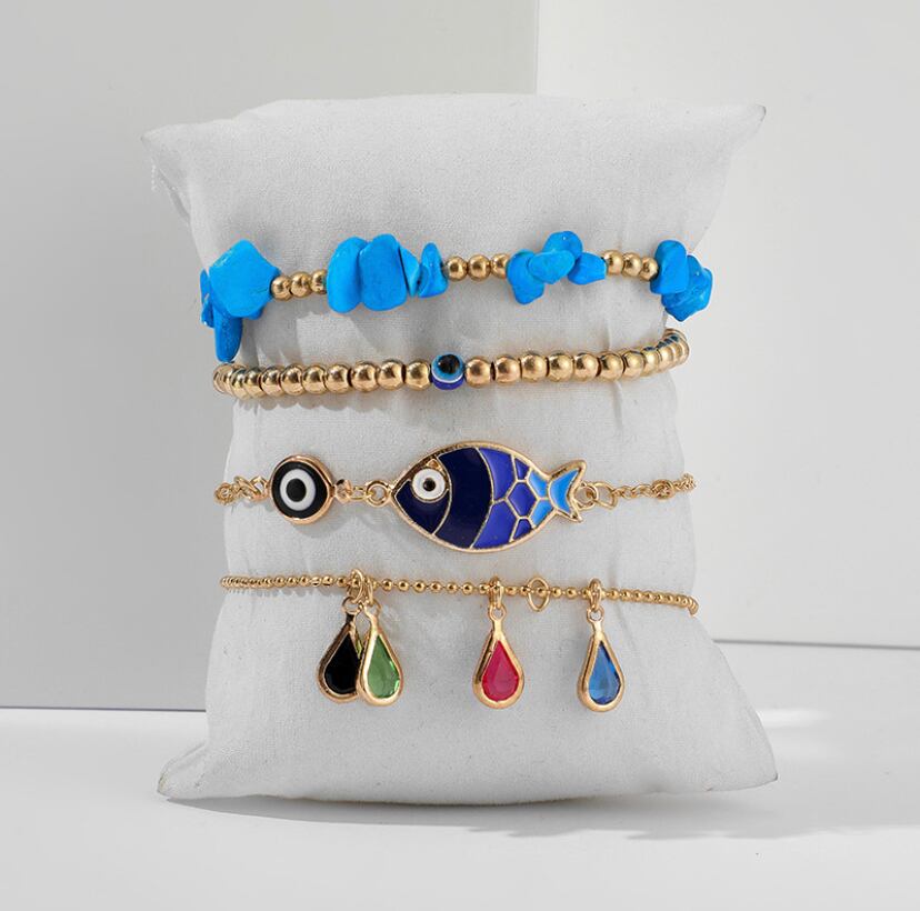 ハワイ ビーチ★アンクレット ブレスレット★魚松石ビーズ★幾何学4枚セット