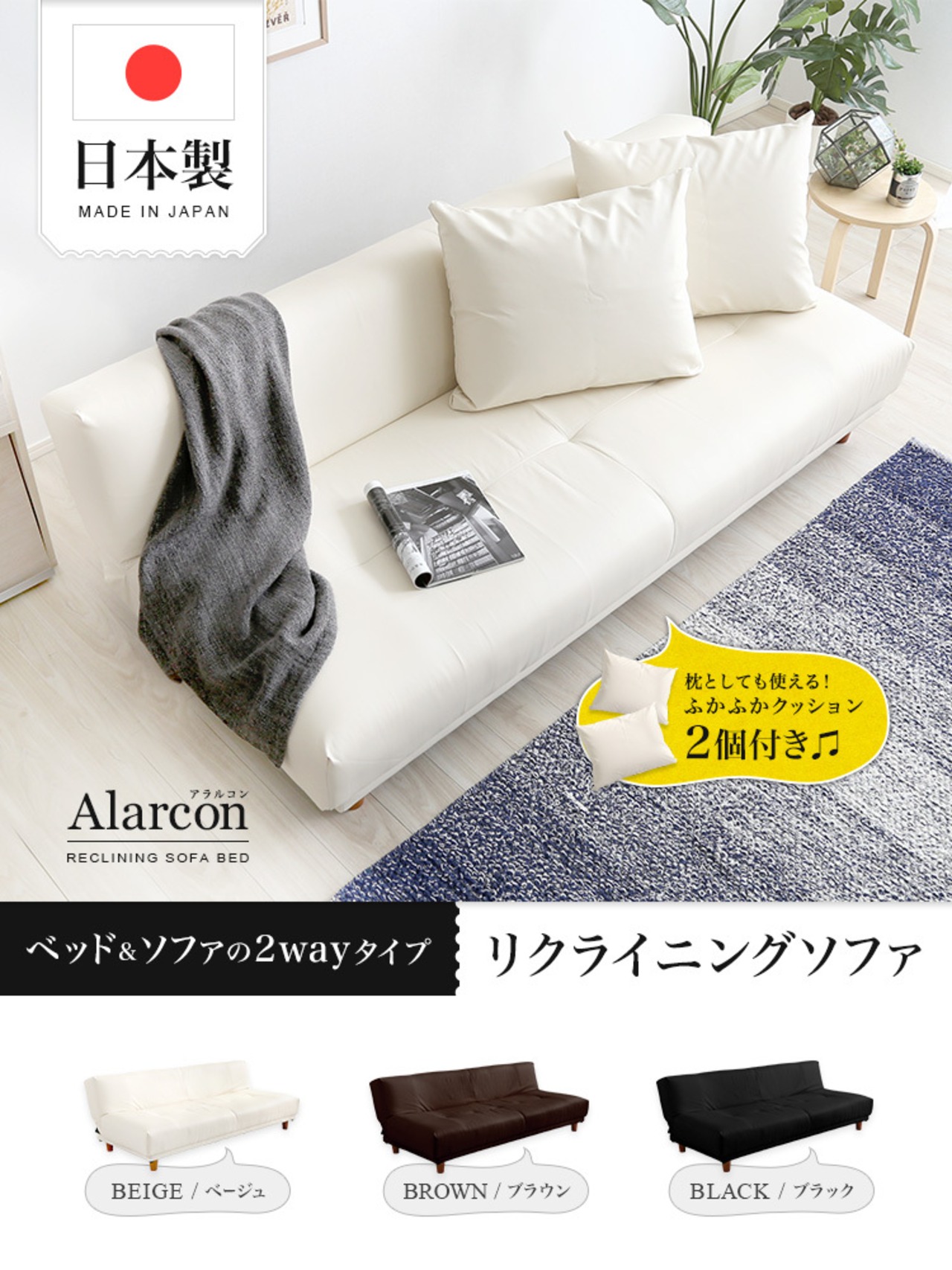 クッション2個付き、3段階リクライニングソファベッド(レザー3色)ローソファにも 日本製・完成品|Alarcon-アラルコン-