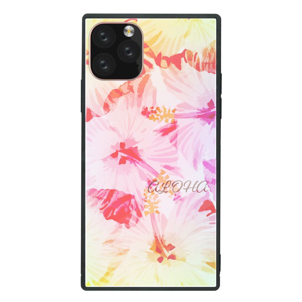 iPhone11 Pro Max XR X/XS 8 7 スクエア ガラスケース ハイビスカス ハワイアン トロピカル グラデーション