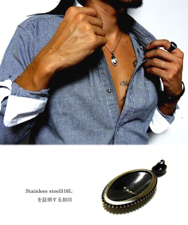 アンティークゴールド オーバル ステンレスネックレス/ステンレスアクセサリー/ブラック メンズ