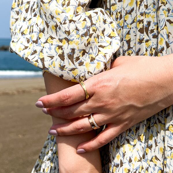 無垢のリングと重ね付けしてるようなデザインでシンプルながら存在感がありセンスのいいリングです。