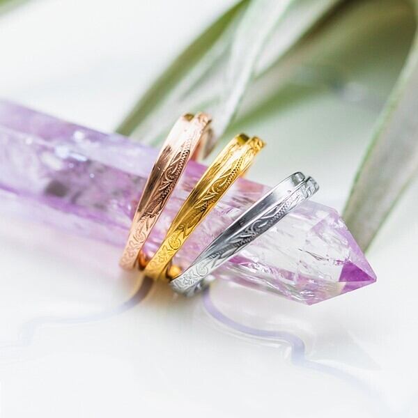 大切な人の幸せを願うハワイの花 "プルメリア" と途切れることのない愛を表すハワイの波 "スクロール" が刻まれた定番のハワイアンリング!